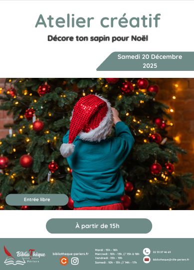 L’équipe de la bibliothèque a le plaisir de vous convier à son atelier de Noël, tout public, le samedi 20 décembre de 15h à 17h. Fabriquez des décorations pour votre sapin, partagez un moment chaleureux autour d’un goûter offert par la municipalité et vivez la magie des fêtes en créant ensemble. Le matériel est fourni.