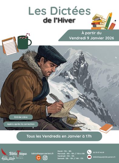 La bibliothèque a le plaisir de vous inviter aux dictées de l’hiver. Elles auront lieu tous les vendredis en Janvier, à 17h, à partir du vendredi 9 janvier. Exceptionnellement, nous vous proposerons de commencer par un texte à corriger avant d’entamer la dictée. Le matériel est fourni. Puis comme d’habitude, la correction se fera en toute bienveillance et sera suivie d’un apéro offert par la municipalité.