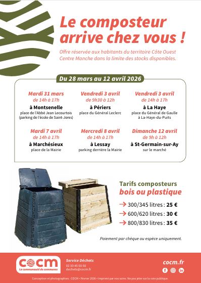 Actualité Agenda Du 28 mars au 12 avril, le service Déchets de la COCM vient à la rencontre des habitants pour parler compostage et réduction des déchets. L’occasion de poser vos questions sur la gestion des déchets, réserver ou repartir avec un composteur adapté à vos besoins.