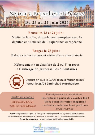 Familles Rurales de Marchésieux a le plaisir de vous proposer un séjour convivial à Bruxelles et Bruges, du 23 au 25 juin 2026 !