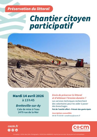La Communauté de communes COCM organise un chantier citoyen participatif le mardi 14 avril à 13h45 à Bretteville-sur-Ay à la cale de mise à l’eau (2479 rue de la Mer).