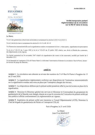 Ci après arrêté pour travaux sur RD57 dans le bourg du 13 au 23/05
